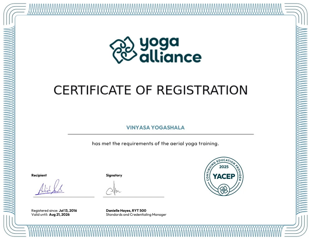 Vinyasa Yogashala in Rishikesh offers a comprehensive certification for becoming an International Yoga Instructor for 100-hour, 200-hour, 300-hour, 500-hour YTT courses along with short courses like Yin Yoga TTC, Prenatal YTTC, Sound Healing, Reiki Healing, Ayurveda and Aerial Yoga YTTC. Yoga Alliance, USA, recognizes us as we ensure higher and better education and training standards in Yoga.